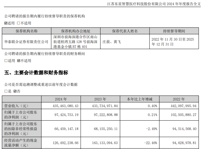 2021年至2024年,东星医疗的扣非后净利润分别为1.03亿元、9451.46万元、6815.53万元、6645.91万元。