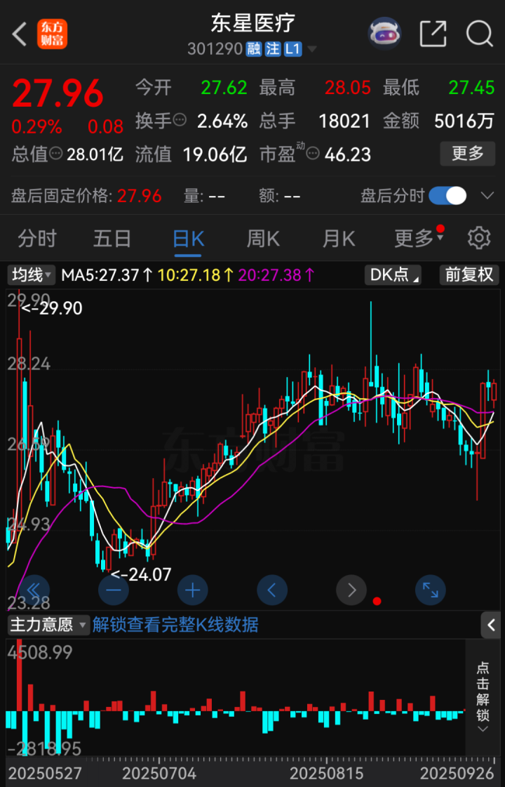 截至9月26日收盘,东星医疗股价报27.96元/股,涨幅为0.29%,总市值为28.01亿元。