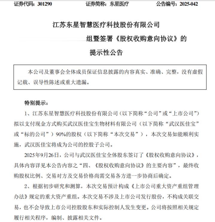 9月26日,东星医疗与武汉医佳宝全体股东签订了《股权收购意向协议》,东星医疗拟以支付现金方式收购武汉医佳宝90%的股权。