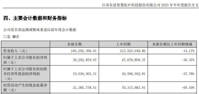 2025年上半年,东星医疗的营业收入同比下降14.17%至1.83亿元,归母净利润同比下降36.47%至3029.29万元,扣非后净利润同比下降37.78%至1903.65万元。