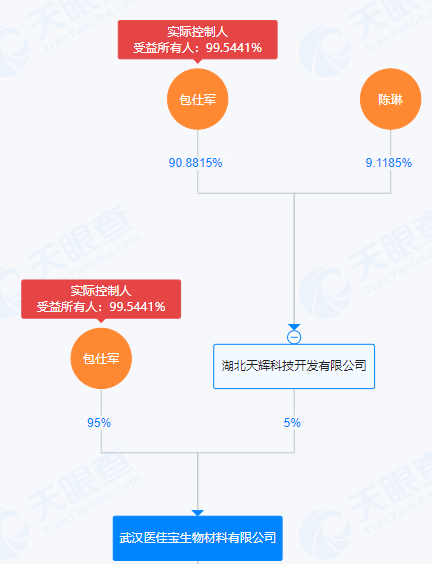 天眼查显示,武汉医佳宝的股东分别是包仕军、湖北天辉科技开发有限公司泰安配资,持股比例分别是95%、5%,其中湖北天辉科技开发有限公司的控股股东为包仕军。