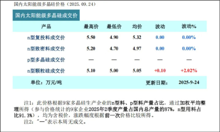 华夏能源网获悉,9月24日,中国有色金属工业协会硅业分会(以下简称“硅业分会”)发布的信息显示,硅料价格已经突破5万元/吨。其中,n型复投料成交均价已达到5.32万元/吨,n型颗粒硅成交均价也已达到5.05万元/吨。